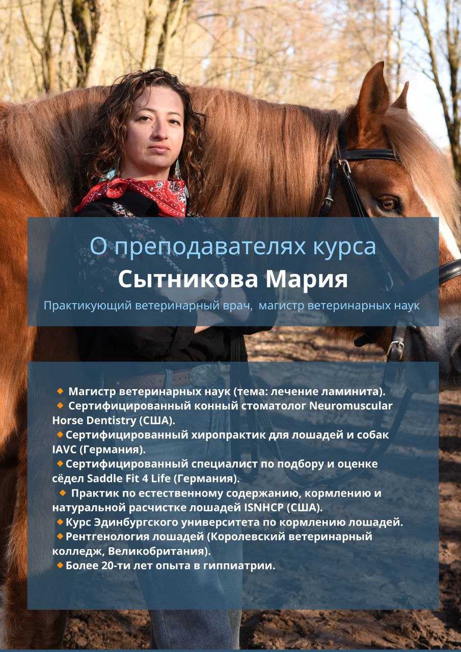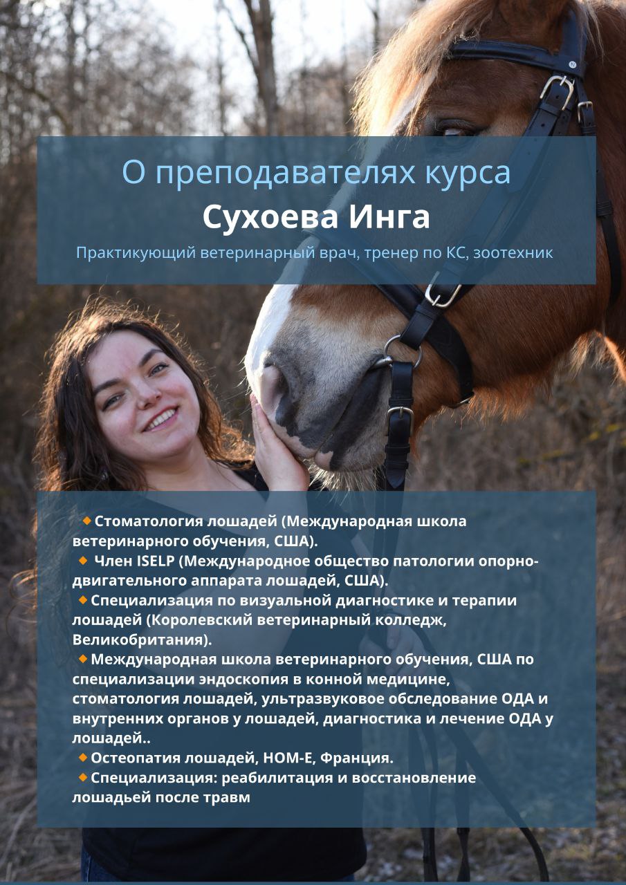 Мы вместе с моей коллегой ветеринарным врачом Ингой Сухоевой уже несколько лет проводим уникальные курсы, аналогов которым нет в СНГ! Это курсы по стоматологии, натуральной расчистке и анатомии лошади.